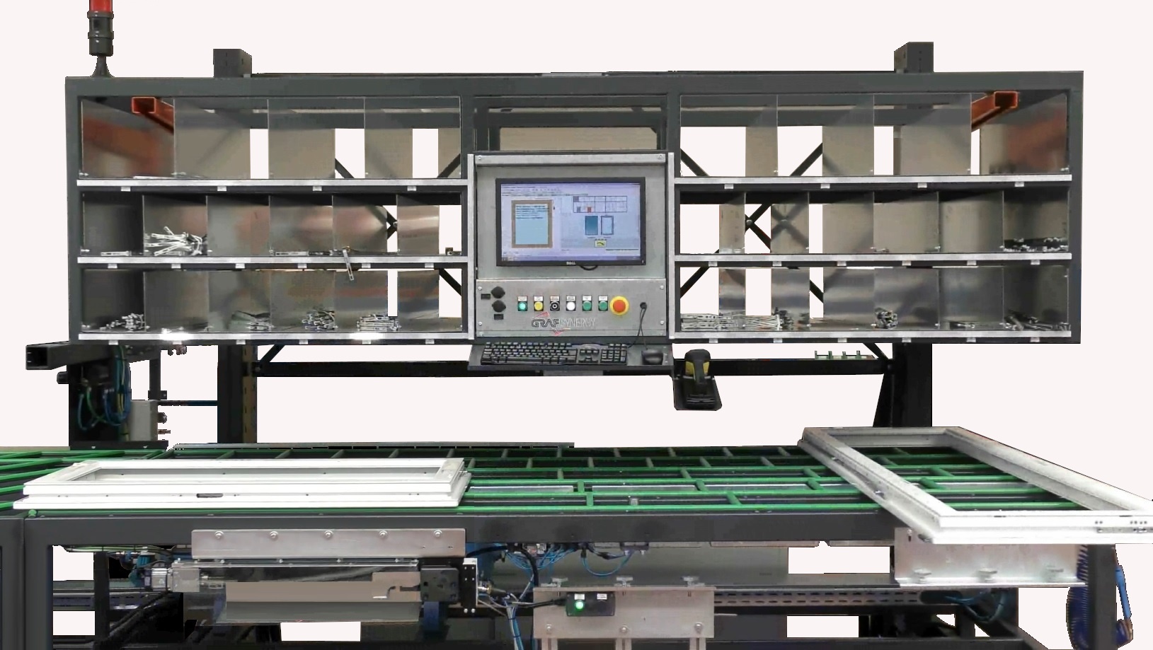 The FAZ II is a compact and automated workstation designed by GRAF Synergy to speed up and standardise the assembly of hardware on PVC doors. With its dual station – preparation bench and screwdriving table – it allows for the assembly of up to 240 frames per shift, with just one operator.